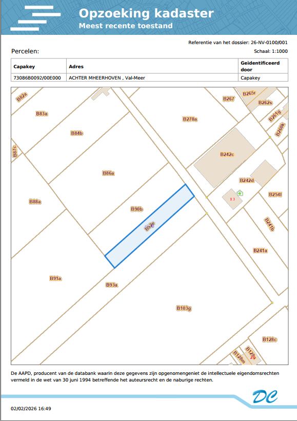 Een perceel landbouwgrond gelegen Achter Mheerhoven, gekadastreerd volgens recent kadastraal uittreksel sectie B, nummer 0092EP0000, met een oppervlakte van acht are vijfenzestig centiare (8 a 65 ca).