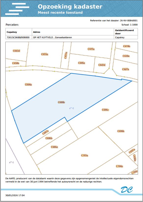 Een perceel landbouwgrond gelegen Op Het Kuytveld, gekadastreerd volgens recent kadastraal uittreksel sectie C, nummer 0688BP0000, met een oppervlakte van één hectare vierendertig are vijfenzestig centiare (1 ha 34 a 65 ca).