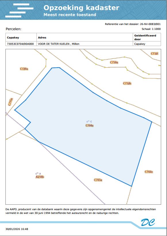 Een perceel landbouwgrond gelegen Voor de Tater Kuelen, gekadastreerd volgens recent kadastraal uittreksel sectie C, nummer 0704AP0000, met een oppervlakte van één hectare veertig are tweeënveertig centiare (1 ha 40 a 42 ca).